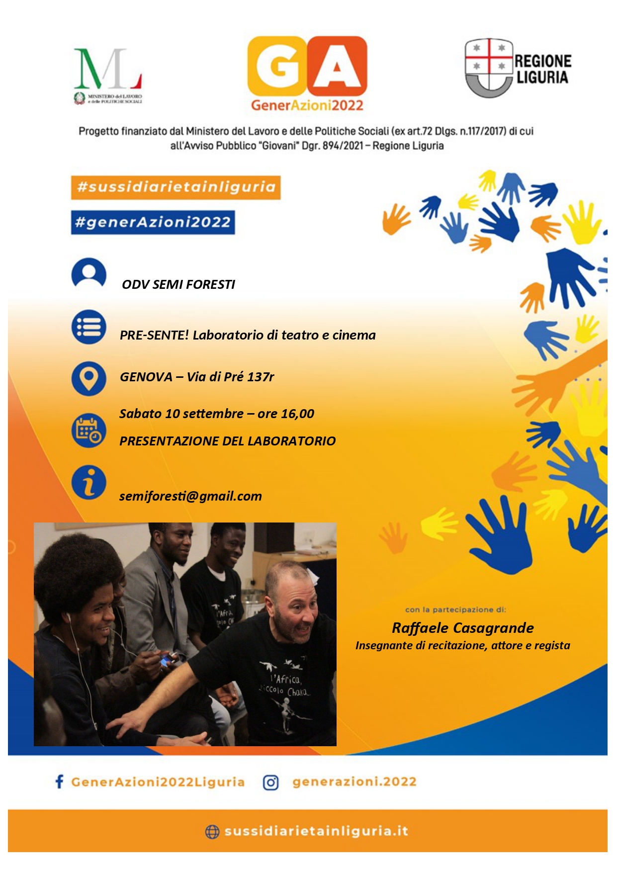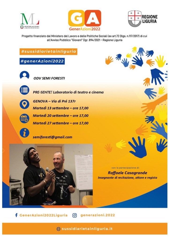 Accorrete numerosi! Sarà un’occasione per conoscersi, per imparare e per mettersi in gioco! L’evento, così come il prosieguo del laboratorio, sarà a titolo gratuito in quanto finanziato con i contributi del progetto di Regione Liguria GenerAzioni2022 #generazioni2022 #sussidiarietainliguria #teatro #sestrierepre #genova #raffaelecasagrande #centrostoricogenova #cinema #intercultura
