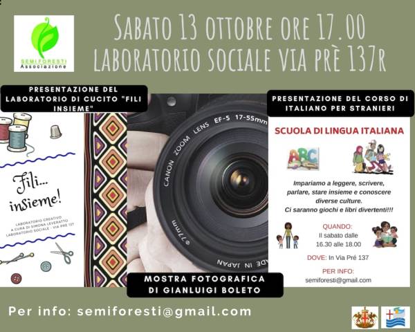 Se volete conoscere meglio le attività dei Semi Foresti questa è l'occasione giusta! Vi aspettiamo Sabato 13 ottobre alle 17 presso il laboratorio sociale di via Pre 137r! Presenteremo il laboratorio creativo di cucito ed il corso di italiano per stranieri! Arricchirà la giornata la mostra fotografica di Gianluigi Boleto.